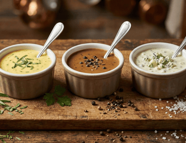 Sauces maison : poivre vert, roquefort, échalote, moutarde, ketchup.