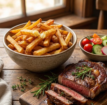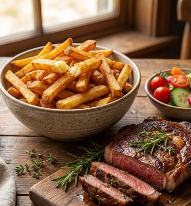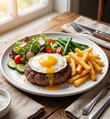 Frites maison, haricots verts, pasta ou salade fraîche au choix.