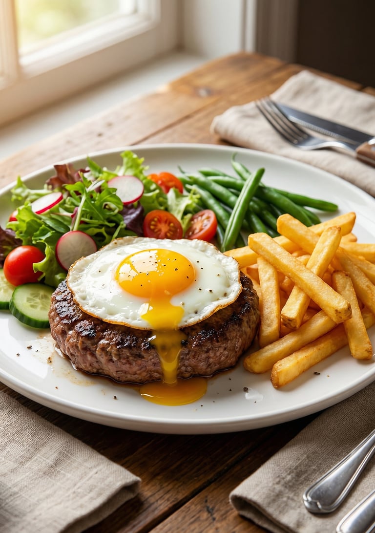 Steak tendre surmonté d’un œuf au plat, servi avec frites maison.