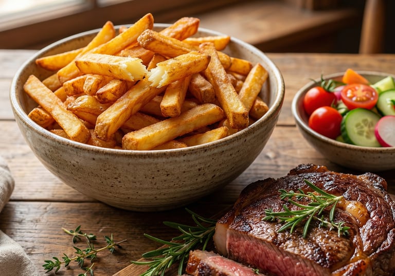 Entrecôte généreuse, grillée à la perfection, servie avec frites maison.