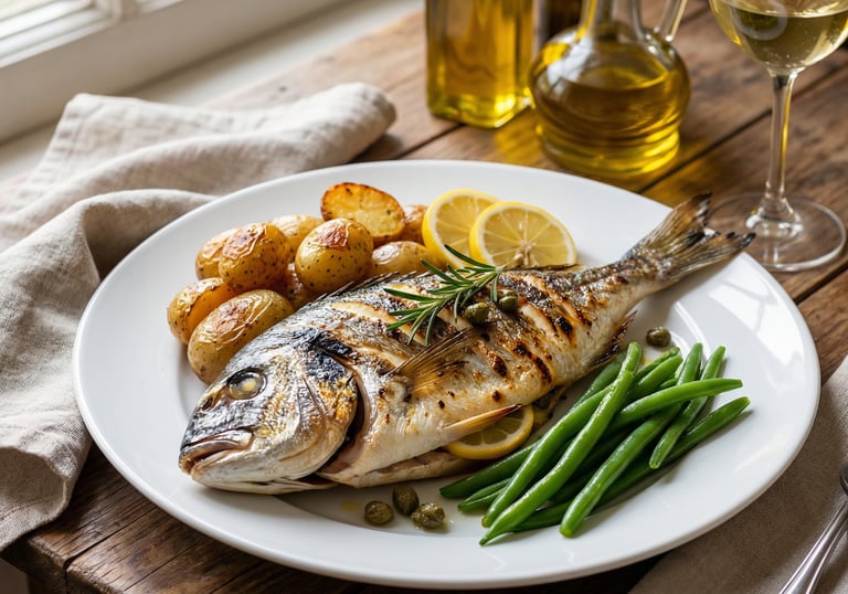 Dorade royale entière, grillée, accompagnée d’une salade composée.